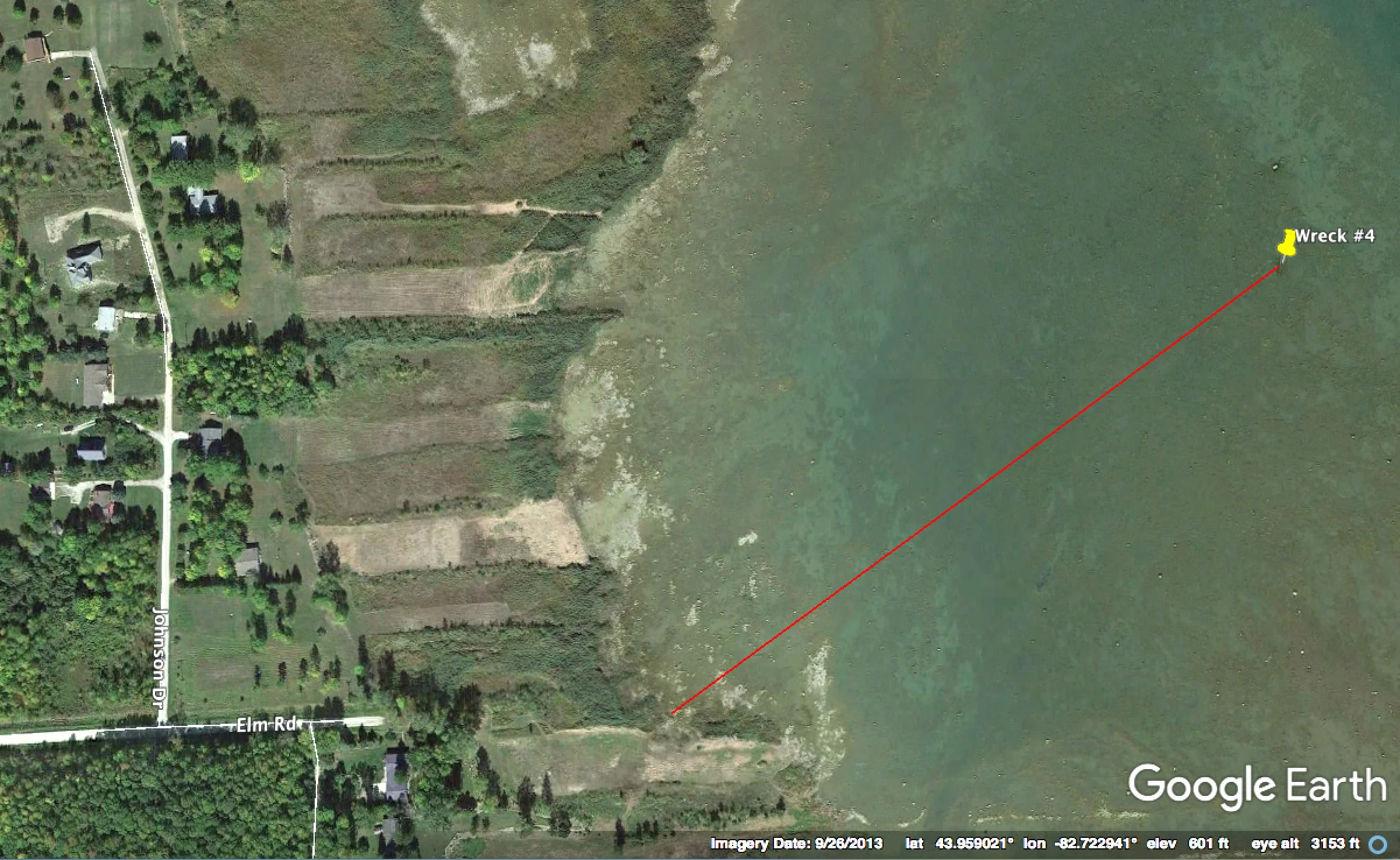 Wreck is 1,300 ft. from shore on a bearing of 55 degrees. A path at the end of Elm Road may provide access. Public parking is not verified. Please respect private property.